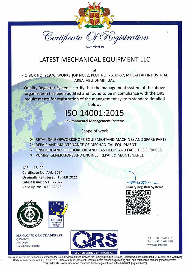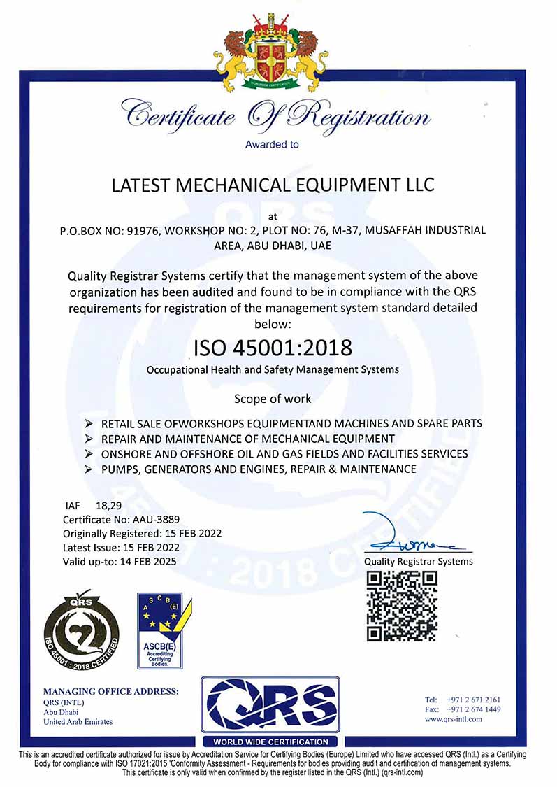 Latest Mechanical Equipment has been providing a wide variety of engineering services to businesses all over the U.A.E. with the highest degree of professionalism. Latest Mechanical Equipment is approved by ISO 9001:2008 is a reflection of its excellent quality and inexorable commitment to high standards of service.